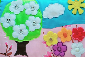 Предлагаем нашим читателям познакомиться с одной из таких книжек-развивашек «Волшебный цветок». На первой странице нас встречает пришитая весёлая матрёшка со шнуровкой, на следующих страницах мы видим детали животных, ягод, машинок, прикреплённых липучками, которые можно сосчитать, прикрепить, распределить на группы. На третьей странице расположились кукольные вещи: юбка, штанишки, шапка, прикреплённые прищепками. Поиграв в гардероб, мы попадаем на страницу с морской тематикой. Можно прикрепить корабль, пощупать ракушки и камушки, сосчитать их, определить величину, и просто полюбоваться. А дальше происходит чудо – перчатка превращается в осьминога. Предлагаем ребёнку сосчитать количество ног у осьминога, глаз, определить цвет. А самое забавное и интересное – надеть на руку такую перчатку и в каждом щупальце потрогать горошины, камни, бусины, бисер и крупу.
