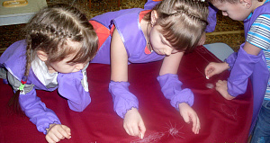Педагог: А ещё можно рисовать мыльной пеной. Хотите попробовать? Для этого снова разделитесь на команды по цвету браслетов. Сначала нужно сделать пышную цветную пену с помощью жидкого мыла, горячей воды и трубочек, а затем приложить к ней лист бумаги. (Каждая команда создаёт свою неповторимую картину.)