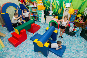 - наборы мягких модулей разнообразной сюжетно-игровой направленности. Модули «одеты» в яркие чехлы из ткани со специальной пропиткой. Из одного комплекта легко собирается железнодорожный состав, из другого можно сооружать различные постройки (дома, мебель, мосты и прочее);
