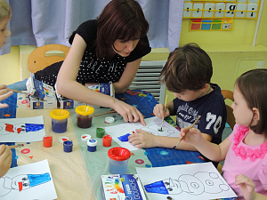 Воспитатель. Давайте сначала узнаем у снеговика, как он хочет, чтобы мы его раскрасили. У нас на столе стоят синяя, жёлтая и красная краски. Снеговик, ребята хотят тебя раскрасить. Как ты хочешь, чтобы они это сделали?