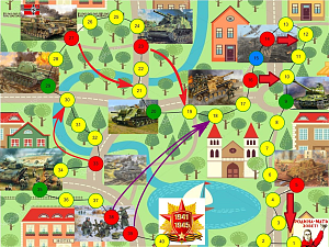 Для наполнения карты компонентами сюжета использовались имеющиеся в сети Интернет в свободном доступе материалы (рисунки, картинки, развёртки кубиков). Развёртки пешек (танков Т-34) я сделал сам в простой программе Paint. Получилась простая в изготовлении, но интересная и познавательная настольная игра.