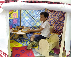 Особенности национального костюма также представлены в наборах рукавичек, кукол на подставке и пальчиковых кукол «Семья казахская». Как в зеркале в них отражаются все аспекты жизнедеятельности: непростой климат, географическое положение, экономическое состояние, социальная среда, уклад жизни, основная деятельность населения.