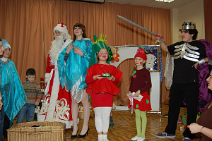 Дети представляют своих персонажей. Например, Чиполлино с друзьями танцуют и рассказывают об Италии; Пеппи-Длинный Чулок поёт и показывает фокусы; Алиса приветствует всех и читает стихотворение на английском языке; мальчик-Новый год поздравляет гостей с наступающим праздником своими стихами.