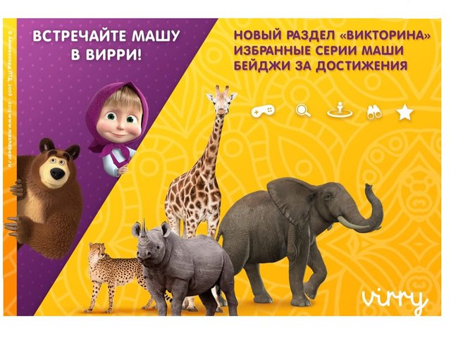 Animaccord и Fountain Digital Labs запустили новый формат семейного мобильного приложения про животных «Вирри» с Машей. Цель проекта – привить детям любовь и заботу о природе. Маша – любознательный ребёнок, который познаёт окружающий мир. В новом скаутском образе героиня самого популярного российского мультсериала становится ведущей викторины о животных. Благодаря приложению дети и взрослые могут узнать уникальные факты о дикой природе.
