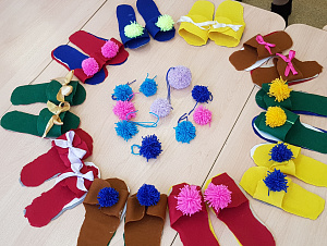 Воспитатель: На столе лежат лист фетра, вам нужно выбрать цвет и выбрать украшения для тапочек. (Дети предлагают идеи для украшения обуви и останавливают свой выбор на помпонах.) Напоминаю, что обувь – это пара, поэтому украшение должно быть одинаково по цвету и расположению на каждой паре.