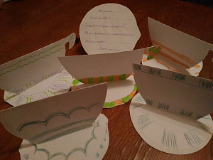 Теперь остаётся вырезать круг размером с блюдце и написать трогательное послание своему Учителю на нём, а потом приклеить поздравление вниз, на блюдце.