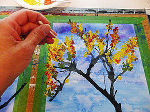 Ведущий: Дорогие мамы, прочтите, пожалуйста, несколько строчек из вашего любимого стихотворения про осень. (Ведущий благодарит мам и приглашает их с детьми занять рабочие места. После чего подходит к мольберту и знакомит с нетрадиционным методом рисования палочками. Ватные палочки используются вместо кисти. В силу особенности такой «кисти» рисунки получаются «точечными», насыщенными яркими мазками. Дети и мамы рисуют осеннее дерево палочками. Ведущий даёт советы и рекомендации по мере необходимости. По окончании работ мамы и дети показывают свои работы.)