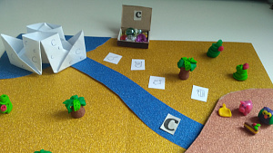 Логопед: Смотри, как много пассажиров. Все они не поместятся на корабль. Командир корабля решил сначала отвезти только тех пассажиров, у которых есть в имени звук «С». Давай купим для них билеты? (Ребёнок рассматривает карточки, выбирает те, на которых нарисованы предметы со звуком «С» и называет их.) Молодец! Мы усадили всех пассажиров на корабль. Давай теперь отвезём их на остров. (Ребёнок продвигает корабль до острова.) Наши пассажиры прибыли на остров. Отдай их билеты пограничнику, назови слова и получи награду за перевозку. (Ребёнок перекладывает карточки на остров, называет слова и получает бусины/камушки) Отлично! Теперь давай отвезём на остров пассажиров, у которых в имени есть звук «З». (Игра повторяется.)