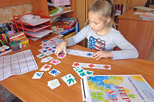 При расположении квадратов в два ряда одинаковые элементы можно располагать по вертикали, по горизонтали, наискось, а листочки концами вверх или вниз. Вариантов игры масса, все они представлены в методическом пособии. Вот несколько вариантов игры для групповых занятий.
