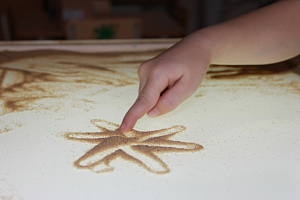• разминка пальчиков на сухом песке (поглаживание, пересыпание, сжимание, перетирание между ладошек, зарывание кистей рук);