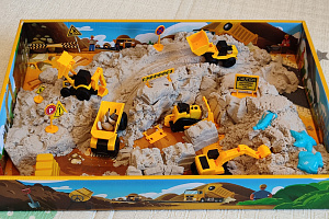 Песок находится в красочной коробке, своим дизайном имитирующей строительную площадку. Размер коробки довольно большой, 54х38х7,8 см. Бортики песочницы не сильно высокие, но для игры вполне достаточно. В наборе есть строительная техника, дорожные знаки, камни и формочка. Песок естественного бежевого цвета, но его относительно немного, 2,5 кг, для полноценной игры мы отдельно докупили ещё 3 кг песка. Хочу отметить, что песок не имеет запаха, не окрашивает руки, и вдобавок, имеет антибактериальную добавку, что делает игры в песочнице безопасными для малыша.