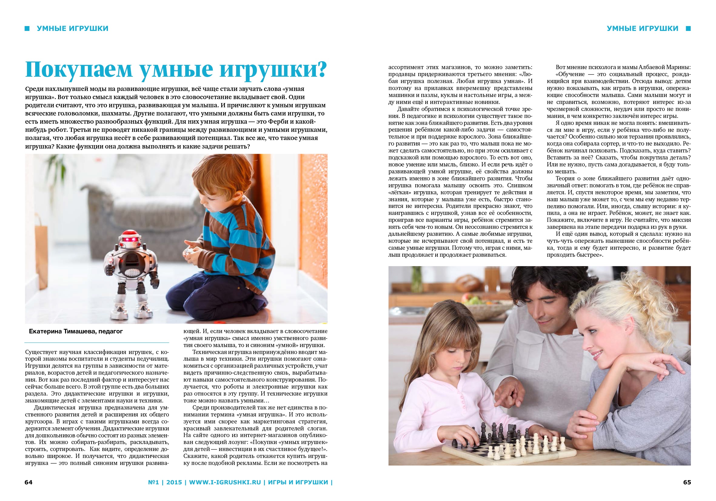 Услышала название и сначала подумала: «Какой скучный журнал. Игрушка, она и в Африке игрушка». Полистала один номер, и оказалось интересно. Информации много разной: и советы мам, и об играх рассказано, и отзывы попробовавших те или иные игрушки, и рекомендации специалистов, статьи об интересных мероприятиях для детей.