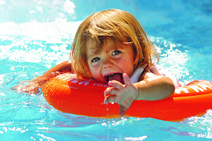 Круг SWIMTRAINER мы купили, когда дочке был год и четыре месяца. На носу была поездка на море и мне, большой любительнице поплавать на глубине, нужно было как-то решать вопрос o том, как обезопасить ребёнка при совместных водных процедурах