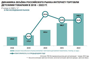 По оценкам «РБК Исследований рынков», оборот онлайн-торговли детскими товарами (без учёта детского питания) вырос в 2022 году на 43% и составил 545 млрд. Существенный вклад в этот результат внесла инфляционная составляющая, способствовавшая увеличению затрат россиян в интернет-магазинах на 16,6% по сравнению с прошлым годом. Особенно сильный рост цен – вплоть до 300% – отмечался сразу после начала боевых действий на Украине. Его причиной были курсовые переоценки и спекулятивное повышение цен, поддержанное ажиотажным спросом