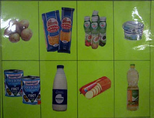 - Игровое поле (8 различных штук). Картонное поле, на котором чётко и крупно размещены в клетках изображения разных продуктов питания (скомпонованных по категориям – молочные, хлебобулочные, мясные и другие).