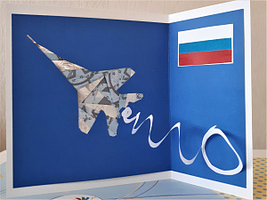 Задумали с внуком сделать ко Дню защитника Отечества подарочную открытку с изображением военного самолёта и обратили внимание, что выбранный нами истребитель МИГ-29 на картинках имеет камуфляжную окраску, в некоторых местах на нём видны блики света и тень. В связи с этим решили попробовать изобразить самолёт в технике айрис фолдинг и использовать упаковочную подарочную бумагу с рисунком. Обычно для работы в этой технике подбирают сочетающийся по цвету и рисунку материал нескольких видов, часто с плавным переходом к более насыщенному тону. Но перед нами была другая задача – преобразить исходный материал с помощью технологических приёмов. Надеюсь, что небольшой мастер-класс поможет читателям подготовить с детьми интересный подарок для пап, дедушек и братьев.