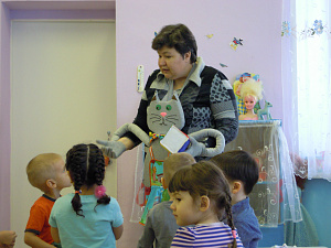 Воспитатель: Дети, кто же это? Кот? А вы хотите узнать, как его зовут? (Воспитатель надевает куклу-кота.)