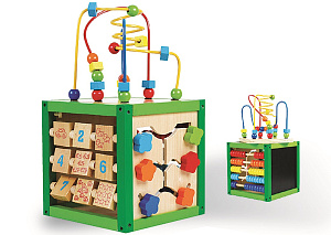 С его помощью ребёнок может составить первое представление о таком понятии, как время. Также куб подходит для игры и рисования. Он представлен четырьмя сторонами и крышкой: грифельная доска для рисования, часы, классические счёты и доска с формами-перевёртышами для обучения письму и счёту. На крышке расположен лабиринт с бусинками.Лабиринт на крышке: внимательно рассмотрите двигающиеся детали. Помогите ребёнку с ними ознакомиться: назовите формы деталей и цвета. Покажите малышу, как можно передвигать детали по проволоке. Переместите любую деталь. Попросите его повторить ваше действие, а затем предложите самостоятельно передвинуть деталь в какую-либо сторону. Усложните задачу: попросите ребёнка переместить указанные детали в заданном количестве в определённую сторону. Это занятие поможет ему ознакомиться не только с цветами и формами, но и с понятиями «направо» и «налево».