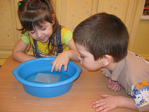 Воспитатель. Верно! Давайте и мы опустим бумагу в озеро. Бумага плавает, не тонет. Достаньте свои листочки и посмотрите, какими они стали?