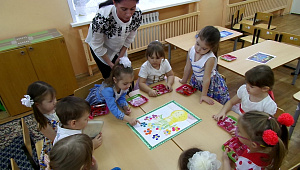 Воспитатель: Ребята, очень скоро в нашей стране будет праздник – День матери. Мама – это самый главный, самый важный человек в жизни, поэтому и дети, и взрослые будут от всей души поздравлять своих мам. А праздник – это радость, веселье и сюрпризы. Как же можно поздравить мамочку? (Дети называют возможные подарки.) Все мамы любят цветы, поэтому предлагаю вам собрать букет для любимых мам. (Педагог соединяет 3 стола, и дети подходят к ним. Педагог привлекает внимание дошкольников к плакату с изображением вазы.)