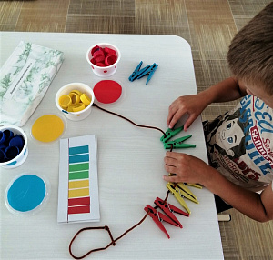 Дидактическая игра «Наряди ёлочку» на закрепление цвета и формы предметов. Перед детьми карточки со схемами. Они нанизывают разноцветные прищепки на верёвочку, соотнося свои действия со схемой.