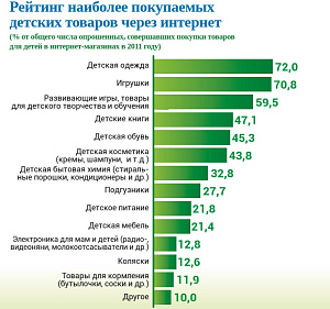 В настоящее время через интернет успешно продаются детская одежда и игрушки. По данным агентства РБК. research, в 2011 году в интернет-магазинах их покупали соответственно 72% и 70,8% респондентов, совершавших покупки детских товаров через интернет. Высока доля покупателей развивающих игр, товаров для детского творчества и обучения. Почти каждый второй россиянин, совершавший покупки детских товаров, приобретал эти товары через интернет. Значительно и число покупателей детских книг, обуви и детской косметики.
