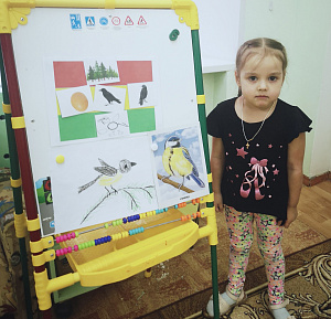 Воспитатель: А сейчас давайте снова возьмём по одной карточке с птицей и сыграем в игру «Светофор». Я называю сигнал, а вы должны на красный сигнал назвать место обитания, на жёлтый – изобразить птицу: «полетать», издать звуки (почирикать, покаркать), на зелёный – сказать, из каких частей она состоит. (Дети берут по одной карточке с изображением птицы и по очереди отвечают в зависимости от сигнала, который им показал воспитатель.)