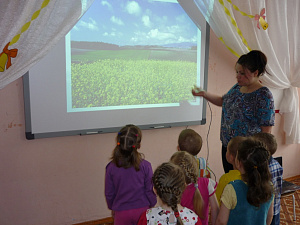 Воспитатель: Но полянка находится далеко, вон там (обращаю внимание детей на интерактивную доску, на слайде изображена цветущая полянка). Не устанете идти?