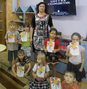 Воспитатель: Ребята, а теперь вместе с Женей мы отправимся в путешествие по сказке «Цветик-семицветик» дорогою Добра. Скажите, в жизни бывают такие цветы? (Нет, только в сказках.) Цветок волшебный. В каждом его лепестке спрятана игра. Закрывайте глаза, скажем волшебные слова: