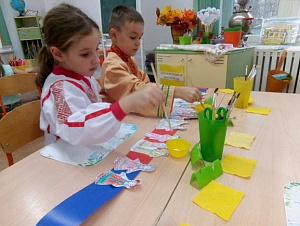 Задание 2. Воспитатель предлагает украсить вырезанные из картона домики национальными орнаментами и устроить свой «Парк дружбы». (За выполненное задание команда получает карточку с ключевым словом – «Край».)