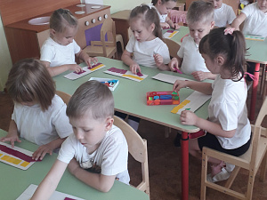 Воспитатель: Ну, а теперь нам пора заканчивать путешествие по такому замечательному городу Наукограду и пора возвращаться в детский сад. Обратно мы поедем на поезде. А вот и наш поезд – пассажирский. (Детям раздаются цветные билеты.) Занимаем свои места. Первый вагон – красный, последний – синий, после красного прицепим – зелёный, между зелёным и синим – жёлтый и т.д.