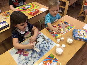 Воспитатель: Возьмите кисточки, обмакните в баночку с гуашью. Мы будем закрашивать силуэты тычком, вот так. (Педагог демонстрирует приём рисования. Дети закрашивают силуэты.)