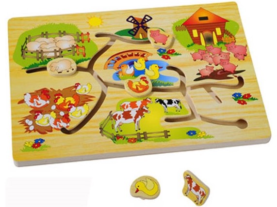 - Деревянные лабиринты, состоящие из дощечки с проложенными на ней извилистыми тропинками, по которым можно двигать фигурки. Задача – поставить фигуры на свои места. Такие игрушки развивают у детей пространственно-логическое мышление, усидчивость, речь и знания об окружающем мире.