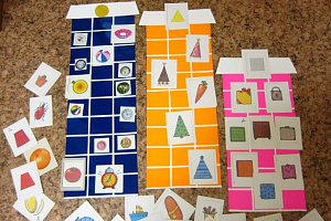 На столе лежит набор домиков. На крышах домиков расположены карточки с изображением геометрических фигур. Перед детьми карточки с изображением предметов.Задание: «Найди и разложи картинки по форме. Назови правильно.»