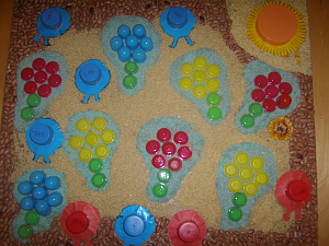 Материал: дидактическое пособие «На солнечной полянке» (выполнено на деревянном щите, который обклеен различными дорожками из пшена, фасоли); человечки-крышки с горлышками от молочных бутылок с расположенными на них изображениями детей: в синих — мальчики, в красных — девочки; цветочки-футляры от бахил, выкрашенные в основные цвета — красный, синий, жёлтый, зелёный; солнышко — большая крышка с горлышком от парфюмерной баночки.