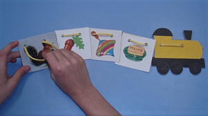 Ход игры: ребёнку предлагается отобрать картинки с предлагаемым (обучаемым) звуком и прикрепить шнурком к вагону.