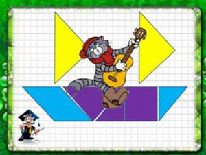 Учитель: Тогда давайте его составим! (Повторение геометрического материала. Два ученика на доске из геометрических фигур составляют корабль, после чего все дети считают, сколько в нём треугольников, четырёхугольников.)