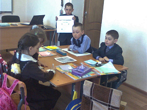 Учитель: На опушке леса сидели 4 ежонка. Упала шишка. Ежата испугались и убежали. Сколько ежат осталось на опушке? (Ни одного, ноль. Решение задачи устно. Проверка задачи по структуре «тейк оф тач дуан»: встают ученики, которые получили в ответе числа «4», «3», «2», «1», «0».)
