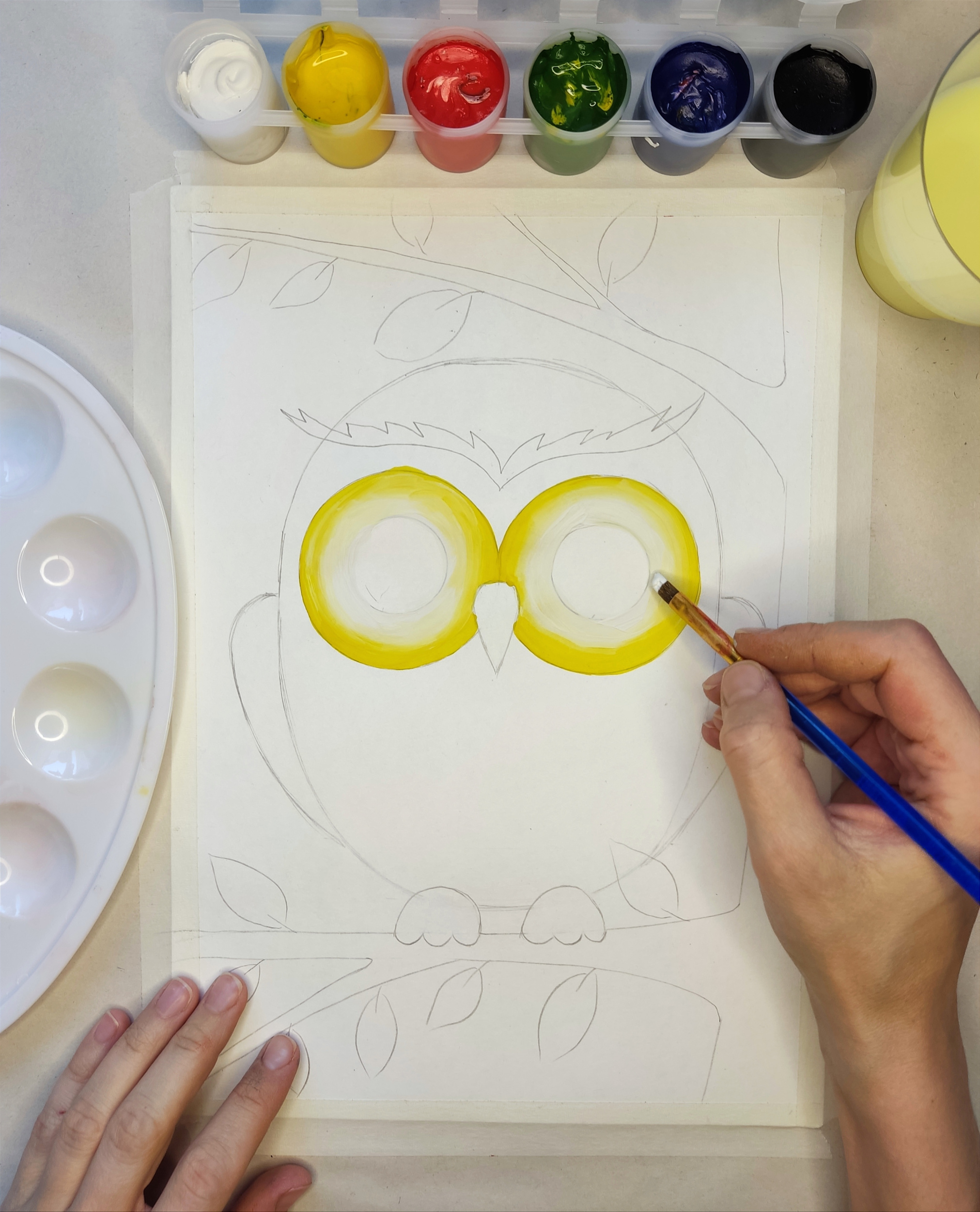 Берём большую кисточку, макаем в белую краску и закрашиваем первый глаз на половину от зрачка к краю (работаем во внешнем круге глаза), затем споласкиваем кисточку и жёлтым цветом делаем переход, чтобы получилась радужка с плавным переходом. Цвет глаз можно сделать любым. Даём глазам подсохнуть и переходим к фону.