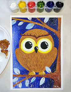 Возвращаемся к сове. Закрашиваем светло-коричневым цветом тело и крылья совы. Также, используя светлый и тёмно-коричневый цвет, закрасим полностью дерево. Светло-коричневой краской закрасим лапки совы. Тёмно-коричневым цветом заполним полностью бровки совы. Набираем на кисточку чёрную краску и закрашиваем клюв и зрачки.