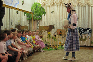 Коровушка: А теперь вам пора возвращаться в свой детский сад. Я буду вас ждать, приезжайте ещё в гости.