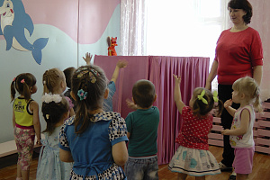 Тук, тук, выходи! На ребяток посмотри! (Воспитатель стучит в двери домика. На ширме появляется волчок.)