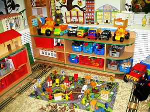 «Юный конструктор», хоть и сосредоточен в одном месте и занимает немного пространства, достаточно мобилен. Практичность его состоит в том, что дополнительные ковровое покрытие, лёгкие макеты домов, дорожные знаки, макеты деревьев легко перемещаются в любое место. Содержимое строительного уголка (конструкторы разного вида, кубики, крупный и мелкий деревянный строительный материал, схемы и чертежи построек) позволяет организовать конструктивную деятельность с большой группой воспитанников, подгруппой и индивидуально, развернуть строительство на ковре, либо на столе.