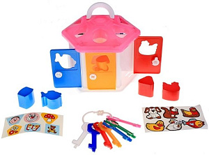Сам сортер упакован в сетку на картонной подложке, с обратной стороны указан производитель и все контактные данные фабрики. Игрушка включает в себя 7 цветных ключей, маленькие двери, 12 фигур (6 геометрических и 6 фигурок животных). А так же наклейки для самостоятельного творчества.Игрушечный домик шестиугольный, в каждой стене есть дверь, ведущая в «комнату». Для каждой двери, как вы уже догадались, есть свой ключ. В дверях домика расположены отверстия для фигурок животных (которые там «живут»), а на крыше – для геометрических фигур. Дверь, ключ от неё и фигуры совпадают по цвету. Белый ключ – универсальный, подходит ко всем дверям.
