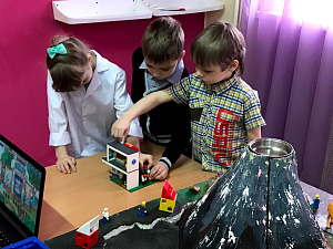 Оборудование: макет вулкана, цифровая лаборатория «Наураша в стране Наурандии» (модуль «Свет», «Звук», «Кислотность», «Температура», «Магнетизм», образовательный набор «Азбука юного электроника», кубики «Курс логики базовый»), робототехнический конструктор LEGO, «Азбука робототехники» (с программой для пиктограммного программирования), искусственная теплица, контейнер с холодной водой и игрушками морских животных, ракушки.