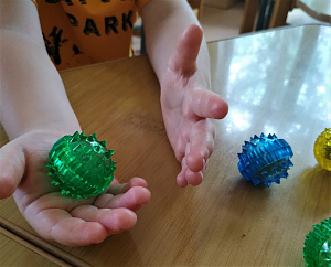 Применение Су-Джок при звуковом анализе слова (используют красный, синий и зелёный шарики). Педагог произносит слово или показывает изображение предмета. Ребёнок выкладывает схему и объясняет свой выбор. Например, к – зелёный шарик, и – красный шарик, т – синий шарик.
