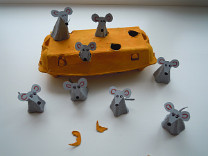 Итак, маленькие мышки готовы, осталось расставить их вокруг сыра. Давайте некоторых мышек поставим в «дырки» сыра. Ну вот и всё, наша поделка готова. Посмотрите, какая она получилась красивая и забавная. Ребята, вам понравилась работа?