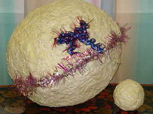 «Падающий снег» красиво смотрится при включённом зеркальном шаре. Под потолком протянуть прочную основную нить по ширине зала. Сделать из бумаги почти плоские кулёчки-тарелочки и повесить их на нитках длиной 20–30 см на основную нить. В кулёчки насыпать конфетти или резаную мишуру. Дёргая за нить у стены, можно добиться вибрации основной нити и снег будет сыпаться.