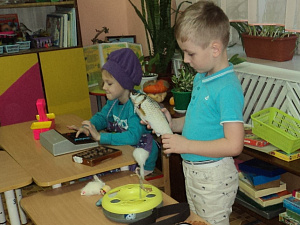 Атрибуты и игрушки: белые халаты, шапочки, медицинские инструменты и «лекарства» из набора «Больница»; аксессуары игры «Парикмахерская», игрушечные телефон, кроватки с постельными принадлежностями; постеры с изображениями животных и птиц; переноски для животных из картонных коробок; игрушки - собаки, кошки, заяц, черепаха и другие животные, посуда, продукты питания.