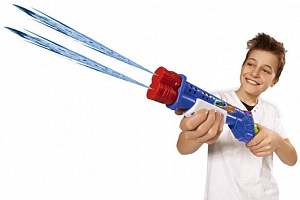 В комплект входит сам бластер и два вместительных баллона для воды. Яркий бластер производится в двух расцветках: белой и синей. Для того чтобы начать стрельбу, нужно всего лишь потянуть за специальный рычаг на себя. Зарядка бластера тоже очень проста. Нужно залить воду в специальные съёмные резервуары, которые при помощи крепления, входящего в комплект, можно крепить к брючному поясу или ремню. Боезапас всегда при вас! Резервуар для воды закрывается при помощи удобной крышки-втулки. Когда происходит смена резервуара в бластере, нужно всего лишь снять крышку и закрепить баллон с водой в своёем оружии. Ваш бластер вновь готов к стрельбе!